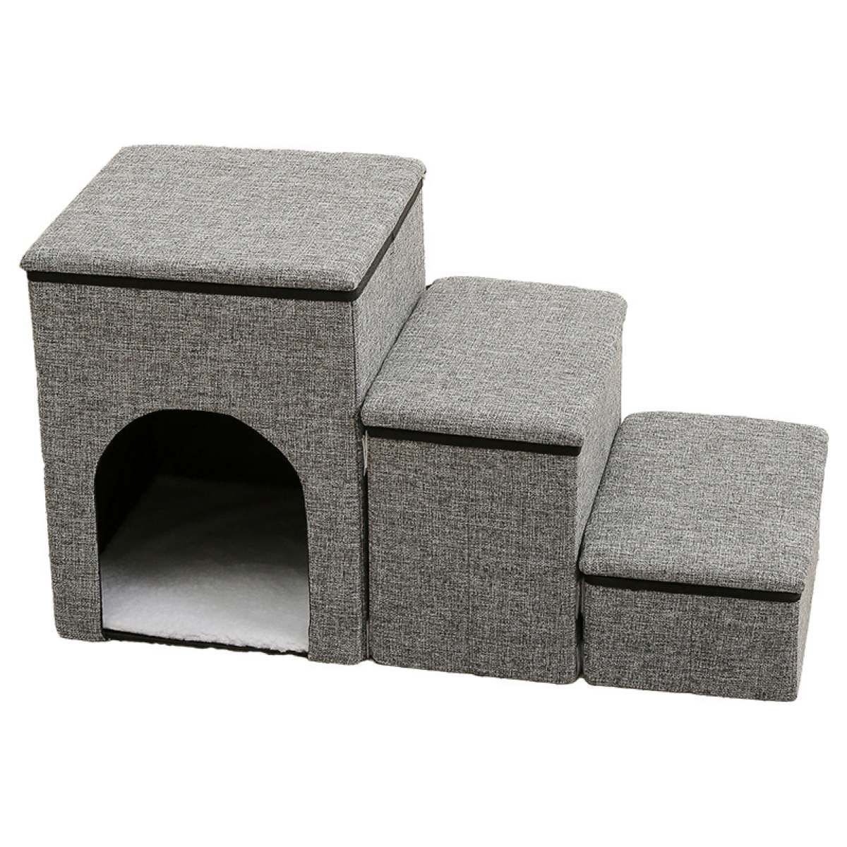 Met drie ruime compartimenten – waaronder een ingebouwde mand – berg je eenvoudig speeltjes, dekens of accessoires op. Dankzij het stevige ontwerp en zachte afwerking loopt je hond veilig en comfortabel omhoog. Bovendien is de trap volledig opvouwbaar, ideaal voor kleinere ruimtes.
